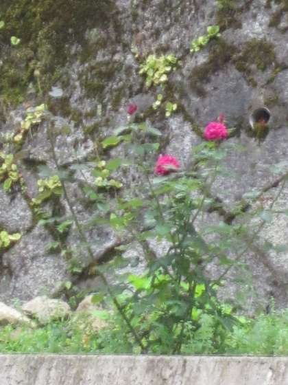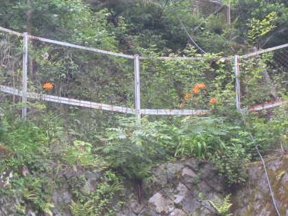 赤い花(バラ)が咲いています。オレンジ色はユリでしょうか。