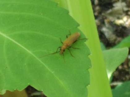 学校園の草花の葉の裏を見ると・・・生き物たちが暑さをしのいで(?)います。名前は分かりませんがじっとしています。涼しくなったら活動を始めるのでしょうか・・?