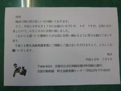 (画像は動物園から来た葉書と,プールから職員室で保護したトンビです。)