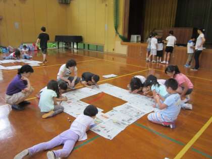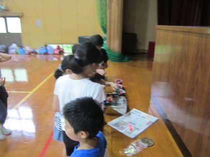 体育館では,『木のバッジ』を作っています。