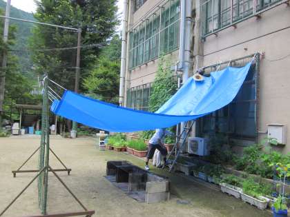 去年は大雨でできなかった野外炊事,今年は今のところ『雨対策』の措置をしています。