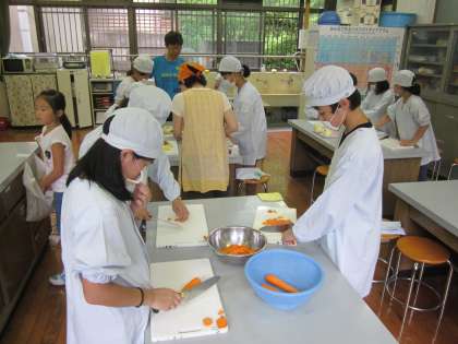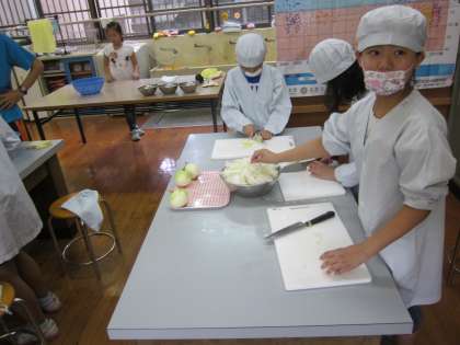 夕食作りは,高学年が中心になって行っています。
