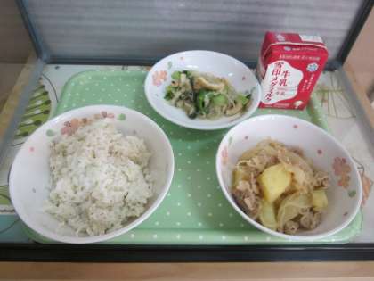 今日の給食は,麦ごはん・牛乳・肉じゃが(ピリカラみそ味)・小松菜と切干大根の煮びたしです。