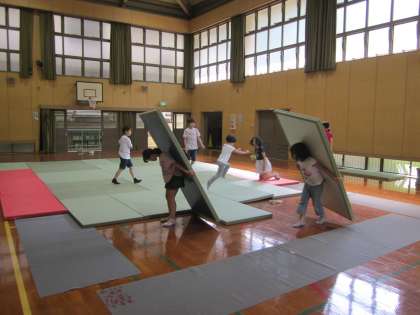 合同練習会が近づいてきました。練習にもさらに熱が入ります。技のかけ方だけでなく,礼儀作法についても教えていただいています。今日もいいお稽古でした。今日は練習前から体育館に来て,みんなで畳を敷いて準備をしました。