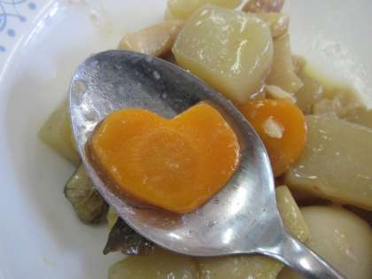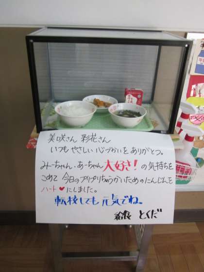 給食調理員さんからのメッセージが,“ハート型のにんじん”に込められていました。