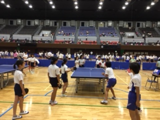 今日は全市卓球交歓会の女子の部です。試合前に練習をしています。