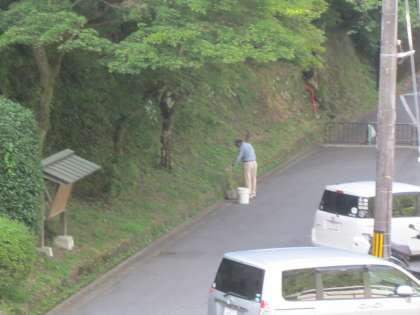 早朝から用務員さんが門掃きをしています。