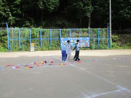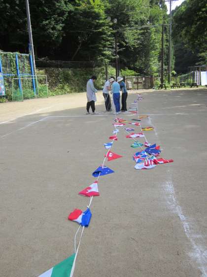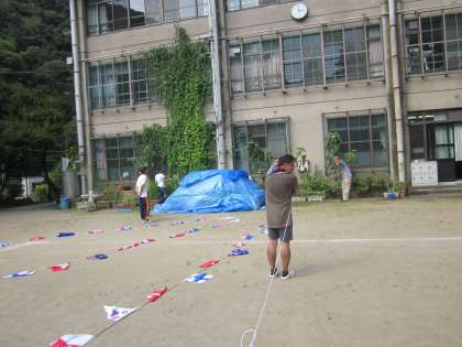 男性教職員はプールで後片付けを.女性教職員は万国旗の準備作業でした。全員汗だくでした。