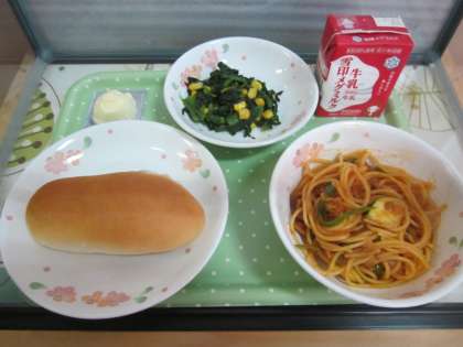 今日の給食は,小型コッペパン・牛乳・イタリアンスパゲティ・ほうれん草のソテー・チーズです。