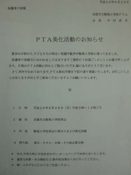 28日(日)のPTA美化活動のお知らせです。お忙しいこととは存じますが,何とぞご参加のほどお願いいたします。