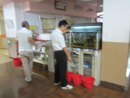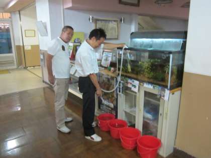 教頭先生と用務員さんが,熱帯魚の水替えをしています。