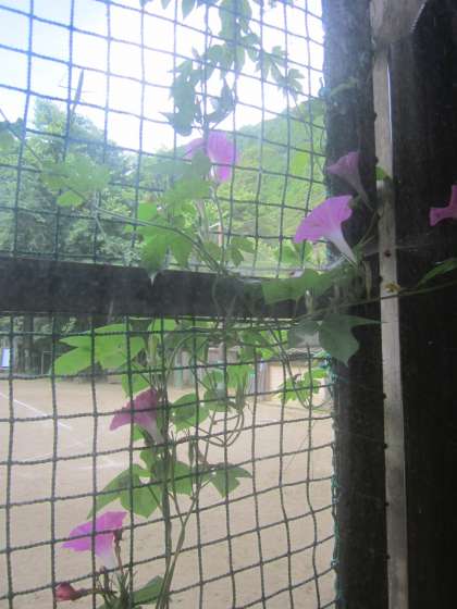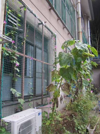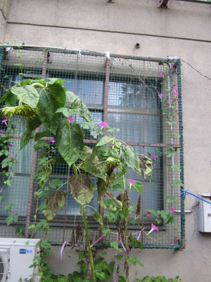 アサガオは元気ですが,ヒマワリは倒れそうです。