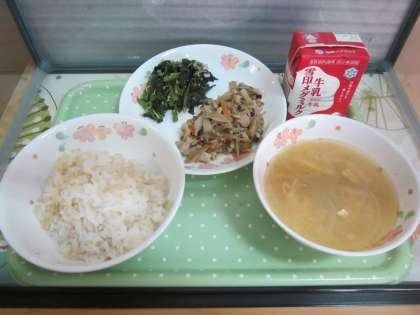 今日の給食は,玄米ご飯・牛乳・とりめし(具)・ほうれん草とじゃこのいためもの・かぼちゃのみそ汁です。『セルフ混ぜご飯』です。