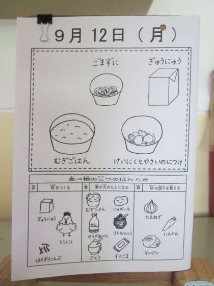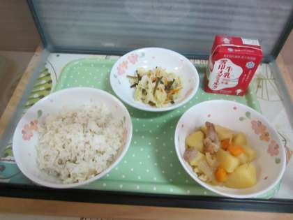 今日の給食は,麦ごはん・牛乳・鶏肉と野菜の煮つけ・ごま酢煮です。