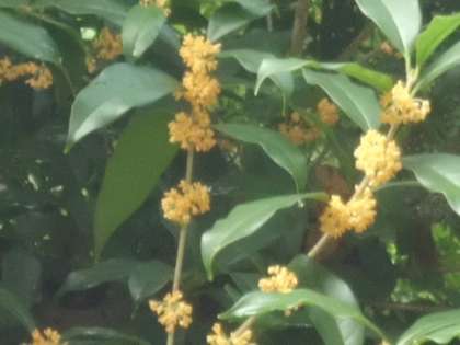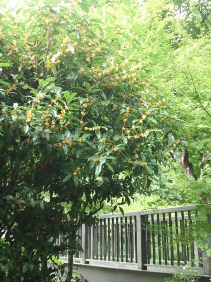 金魚の池のそばの金木犀がかわいいオレンジ色の花をつけ,いい香りを漂わせています。虫たちも寄ってきているようです。