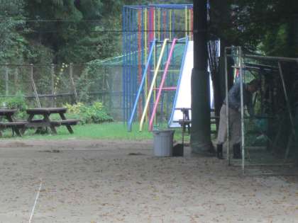 ムクの木の下で,管理用務員さんの作業が続きます。