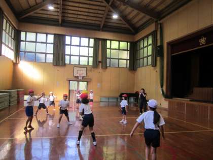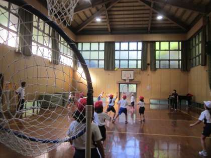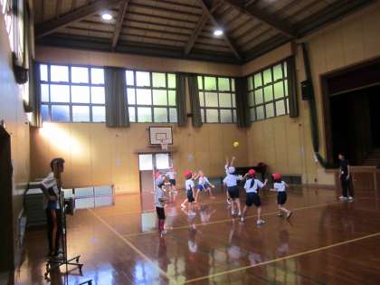 鞍馬っ子が〖パスゲーム〗を楽しんでいます。ポートボールやバスケットボールへとつながっていくスポーツです。