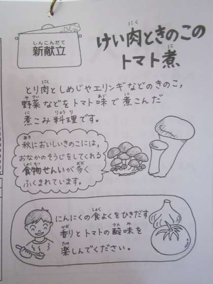 今日の給食は,コッペパン(国産小麦100パーセント)・牛乳・ツナごぼうサンド(具)・マヨネーズ・鶏肉ときのこのトマト煮です。