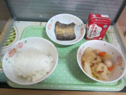 今日の給食は,ごはん・牛乳・開き干し秋刀魚のから揚げ・関東煮です。