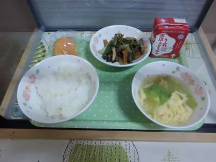 今日の給食は,ごはん・牛乳・レタスとたまごのスープ・プルコギ・柿です。