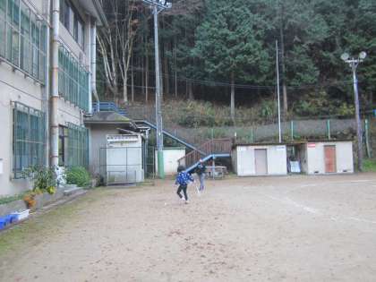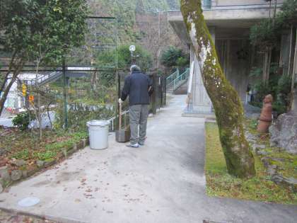 バドミントンをしている横で,用務員さんの作業が始まっています。