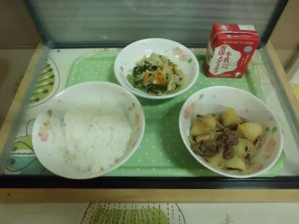 今日の給食は,ごはん・牛乳・肉じゃが・切り干し大根の煮つけです。今日も感謝の気持ちをこめて,「いただきます!!」