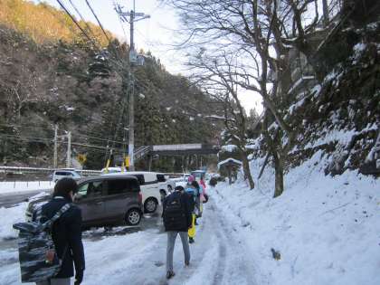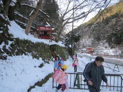 中学生も一緒に,雪道を歩いています。