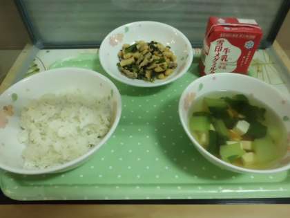 今日の給食は,麦ごはん・牛乳・豆腐と青菜のスープ・にくみそいためです。今日も感謝の気持ちを込めて「いただきます!!」