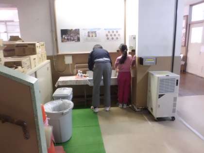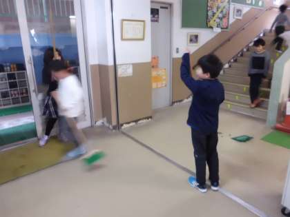 水が冷たくて大変ですが,今日も一生懸命掃除を頑張る鞍馬っ子たちです。チャレンジ体験の中学生も一緒に頑張っています!!