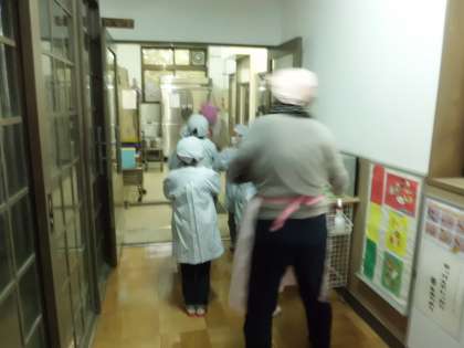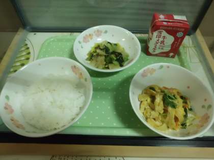 今日の給食は,ごはん・牛乳・あげたま煮・はくさいのごま煮です。今日も元気にあいさつ。「いただきます!!」
