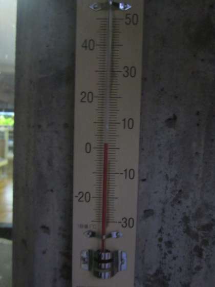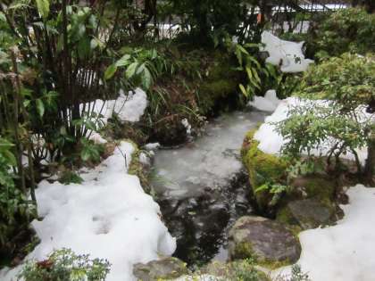今朝の気温は2度,霧雨です。池の氷も融けてきています。