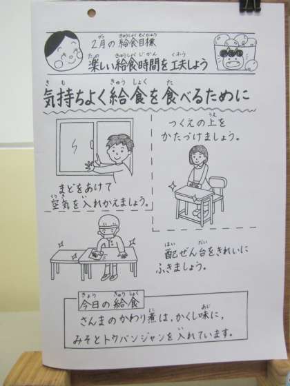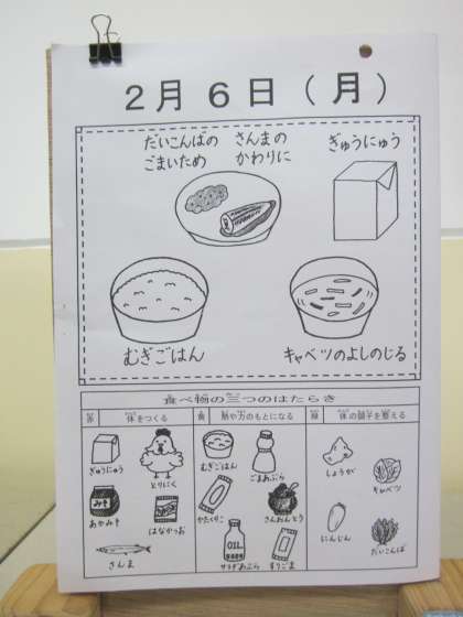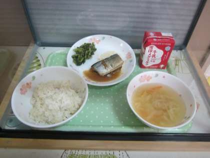 今日の献立は,麦ごはん・牛乳・さんまのかわり煮・だいこん場の胡麻いため・キャベツの吉野汁です。