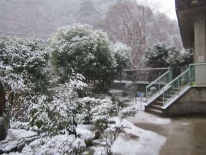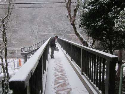 雪の中を,管理用務員さんの作業が始まっています。