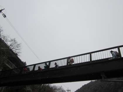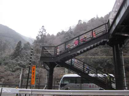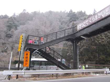 「歩道橋,滑らないように,ゆっくり歩きましょうね。」