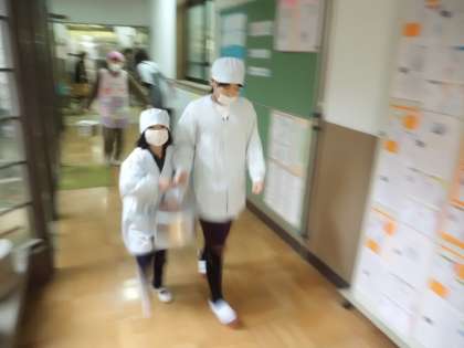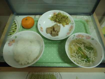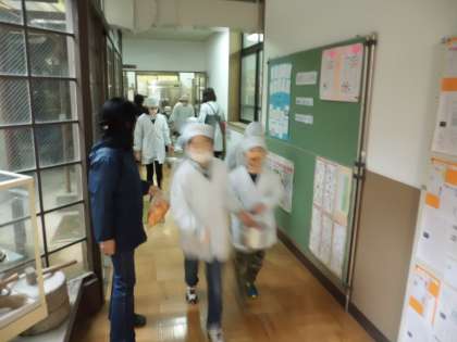 今日の給食は和献立です。ごはん・なま節のしょうが煮・すぐきのいためもの・花菜のすまし汁・みかんです。今日はたてわりグループで食べます。いつもと違う雰囲気に,みんな笑顔でおいしくいただきました。
