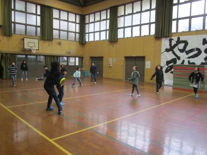 給食後,ドッジビーを楽しんでいます。