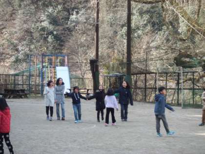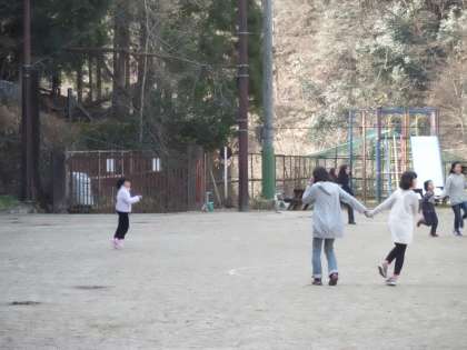 中間休みはみんなで手つなぎ鬼をしています。運動場を所狭しと走り回っています。体がポカポカに温まったのでは・・・。