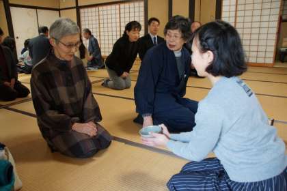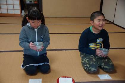 笑顔で茶道の楽しさに触れる鞍馬っ子です。
