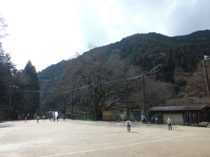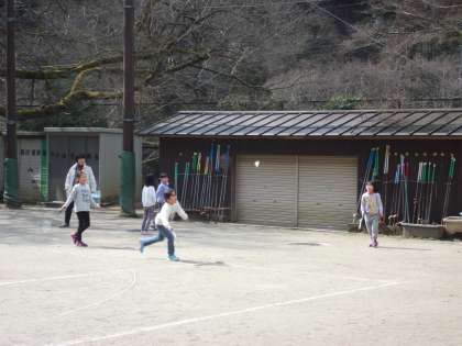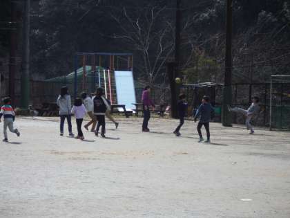さっきまで降っていた雨がやみ,運動場で元気いっぱい遊んでいます。