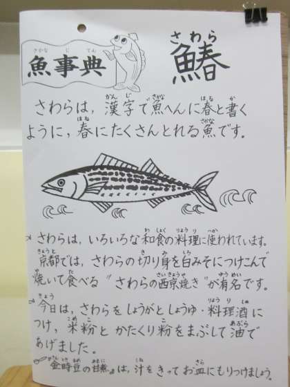 今日のこんだてに,“鰆(さわら)”というおお魚があります。