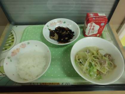 ごはん・牛乳・ひじきとれんこんのいため煮と,ちゃんぽんがよく合います。具が多くて温かくて,とてもおいしかったです。