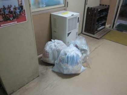 管理用務員さんが,スロープ横のコンテナにゴミを分別して出します。