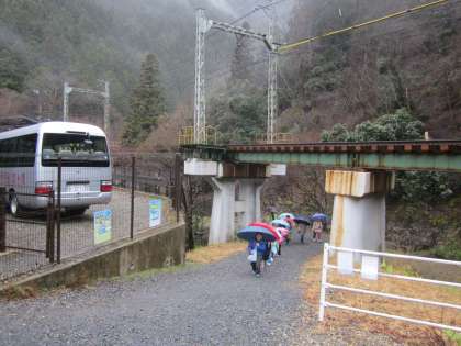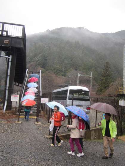 傘を差して,一列になって