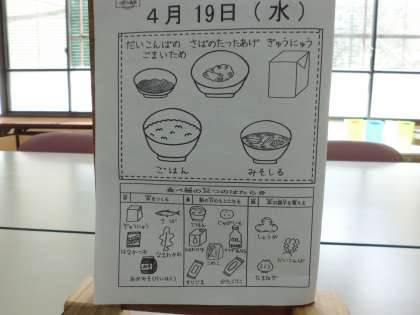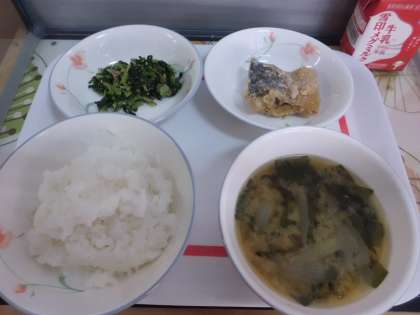 今日の給食は,ごはん・牛乳・みそ汁・さばの竜田揚げ・大根葉のごまいためです。