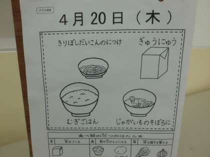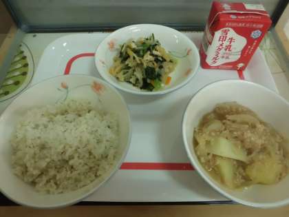 今日の給食は麦ごはん・牛乳・じゃがいものそぼろ煮・切り干し大根の煮つけです。
