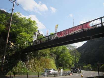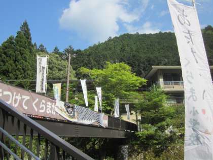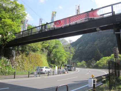 下校する鞍馬っ子が,のぼりの言葉を,一つずつ読んでいました。