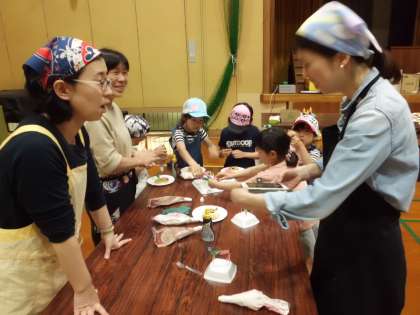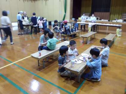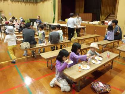 ソフトクリームの後は体育館でホットケーキをいただきます。