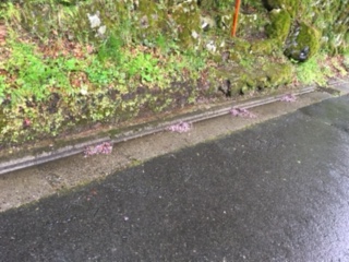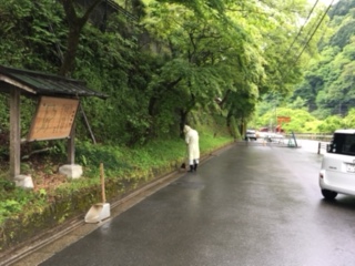小雨が降り続いています。天気予報では『雨のち曇り,所により雷雨…。』です。レインコートを着ての門掃きです。落ち葉や小枝を少しずつ集めています。