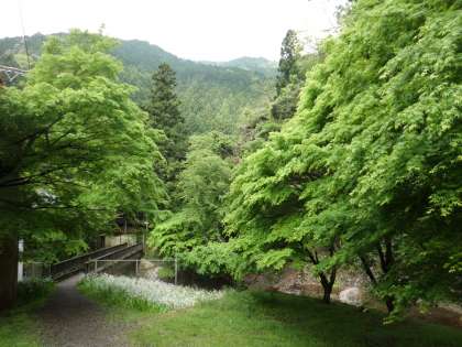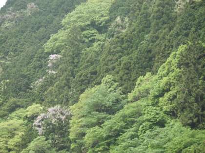 この季節は新緑がとても美しく,またシャガも満開で学校の周りを彩っています。山の中腹には藤の花が見えます。