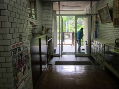 みんなの靴底から砂が…。管理用務員さんが掃いています。